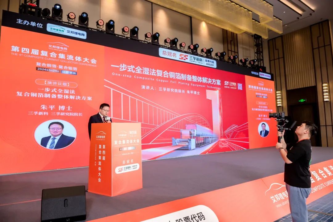蓝狮新科研究院院长朱平博士代表蓝狮新科作开幕致辞,并发表《一步式全湿法复合铜箔制备整体解决方案》主题演讲,提出了蓝狮新科在新能源材料领域的长远规划和坚定承诺。他在发言中指出,该技术的成功研发和应用,标志着蓝狮新科在复合集流体技术领域迈出了坚实的一步。