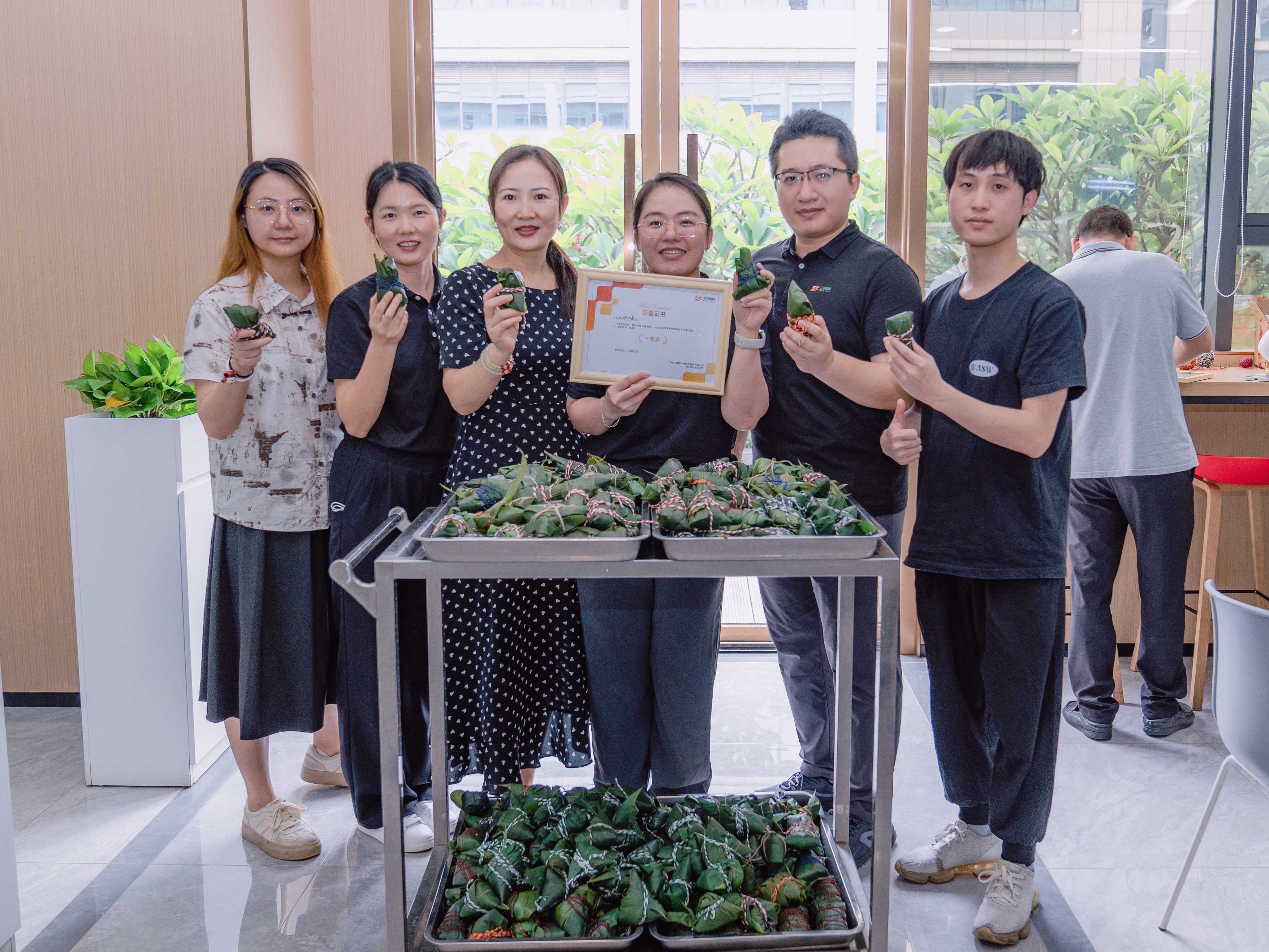 经过激烈的角逐,最终由工会主席、总经办、人力行政中心联合评选出,本届粽子大赛的”粽王”花落“五湖四海”队;人品大爆发队荣获二等奖;恭喜发财队获得三等奖;团结力量队获得四等奖。