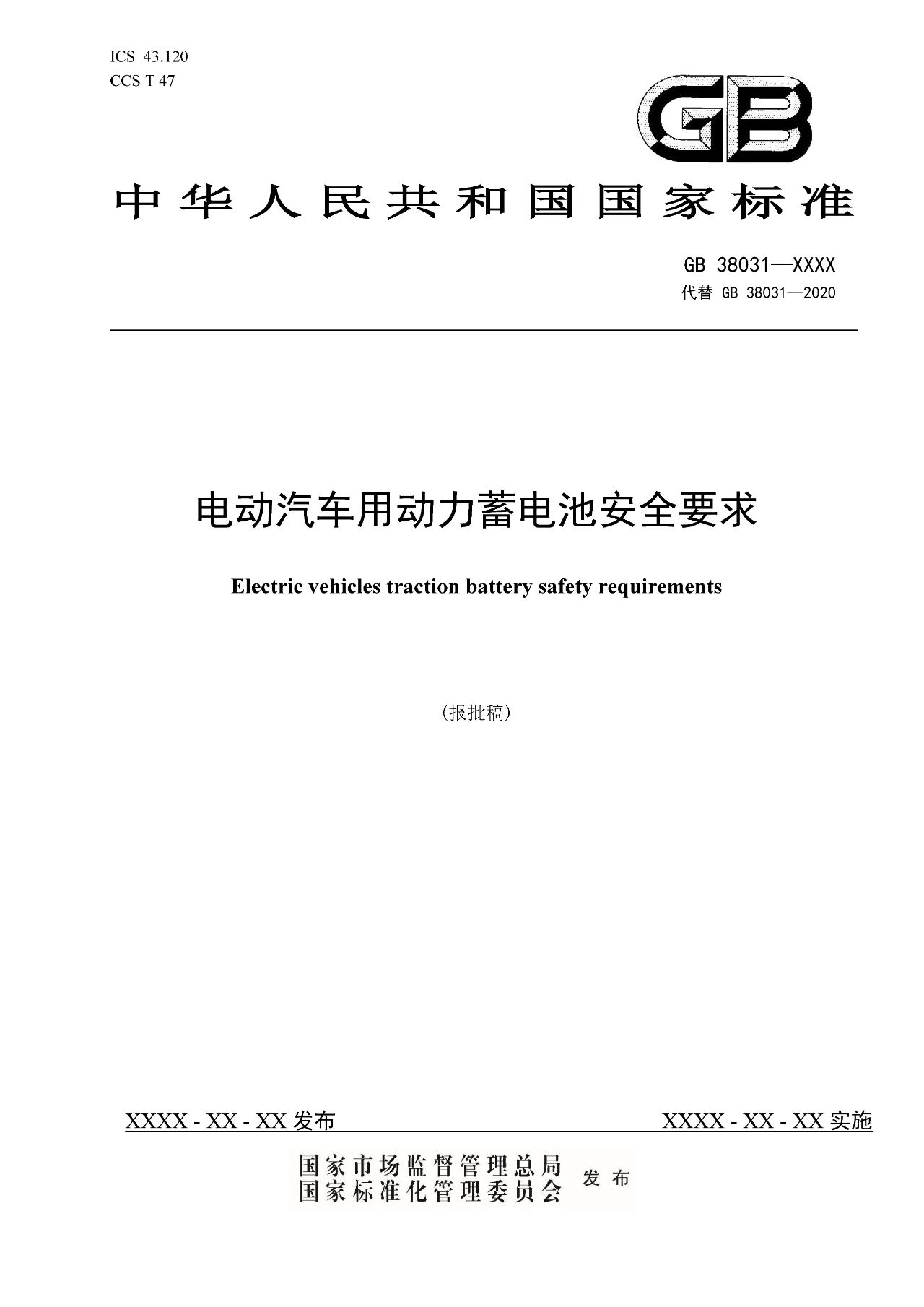 新版标准将代替GB 38031—2020《电动汽车用动力蓄电池安全要求》。