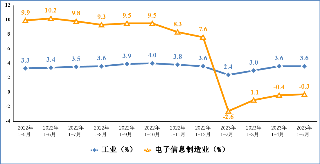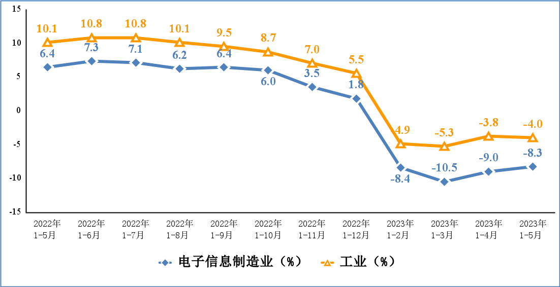 1—5月份,规模以上电子信息制造业增加值同比下降0.3%,降幅较1—4月份收窄0.1个百分点,增速分别比同期工业、高技术制造业低3.9个和1.7个百分点。5月份,规模以上电子信息制造业增加值与去年同期持平。