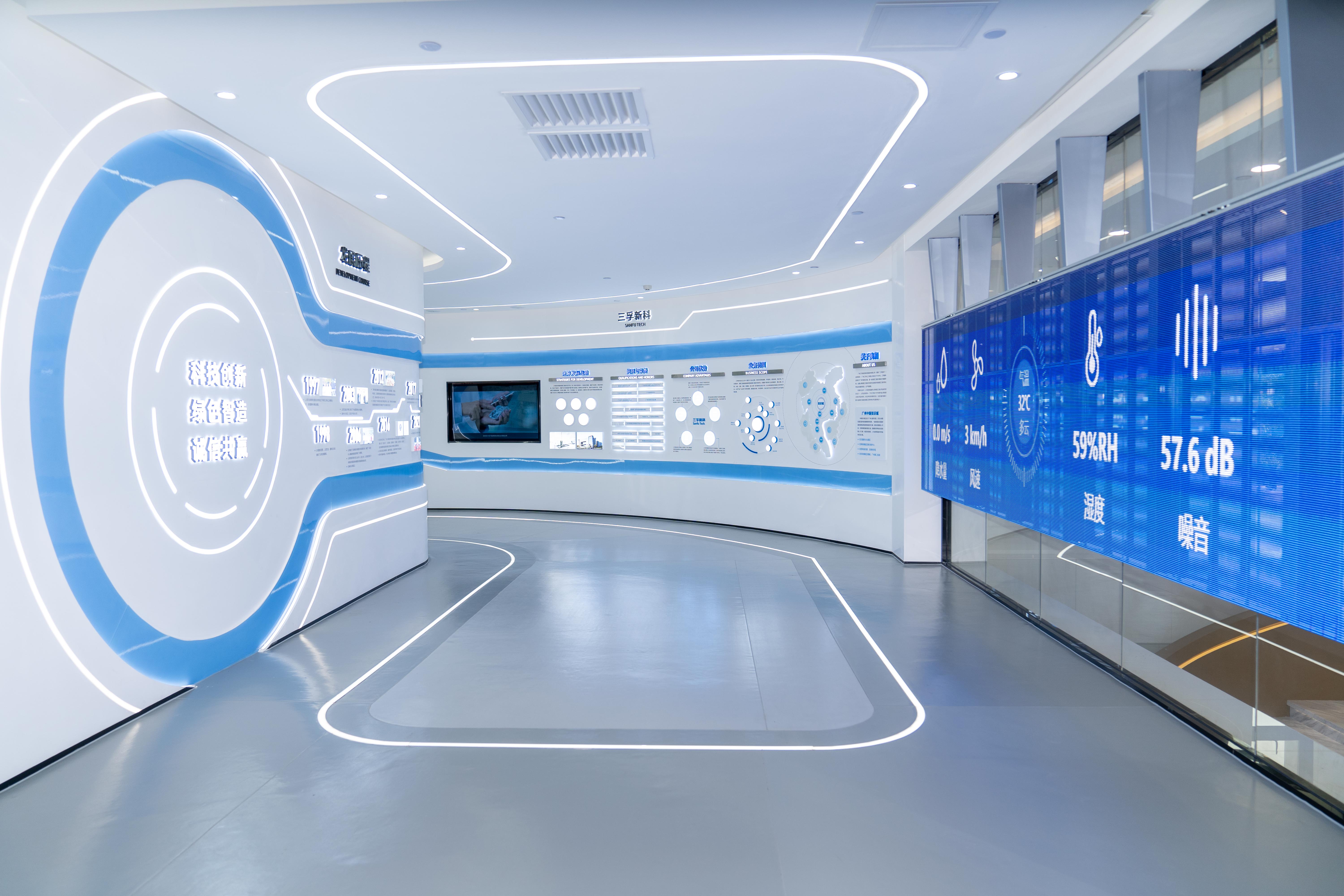 蓝狮新科数字展厅,坐落于中新广州知识城蓝狮新科总部行政大楼内。依循「科技驱动」的品牌基因,蓝狮新科数字展厅集行业科普、公司介绍、前沿技术展示、场景式互动等五维功能于一体,更直观、更便捷、更生动地展示各类全新表面工程“黑科技”。