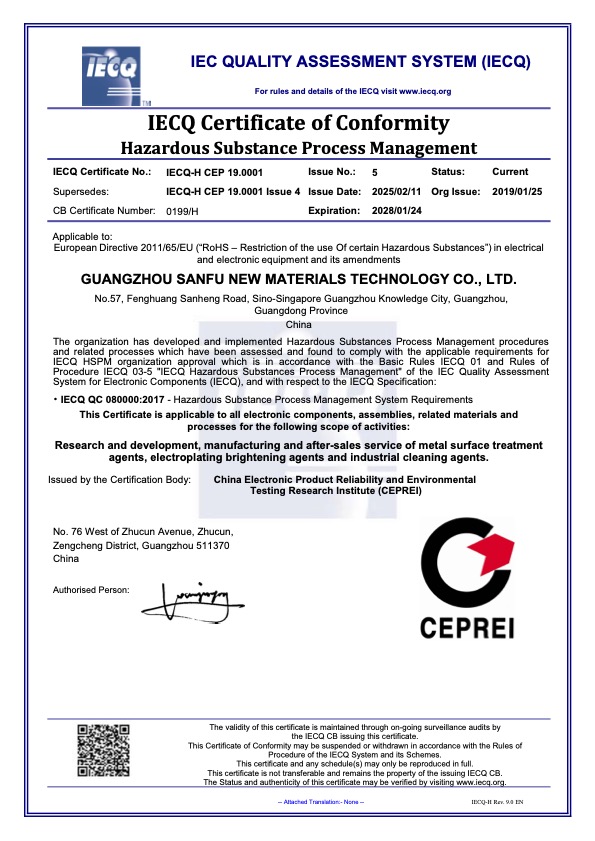 19 SF-无氰沉锌剂获得2018年广东省高新技术产品认定 广东省高新技术企业协会 2018年12月